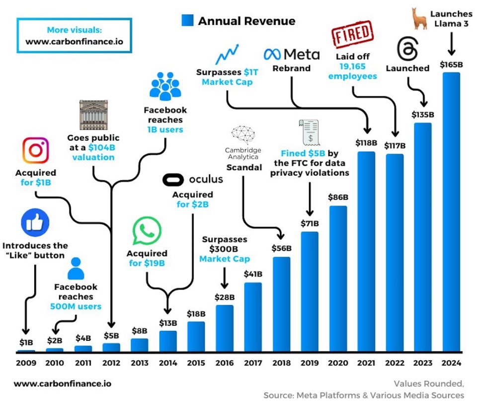 Meta nel 2023 era il secondo player del settore dietro proprio a Google (di cui abbiamo parlato qui), con ricavi di oltre 130 miliardi, in crescita del 20% l’anno in media negli ultimi 5 anni, in accelerazione nel 2024.