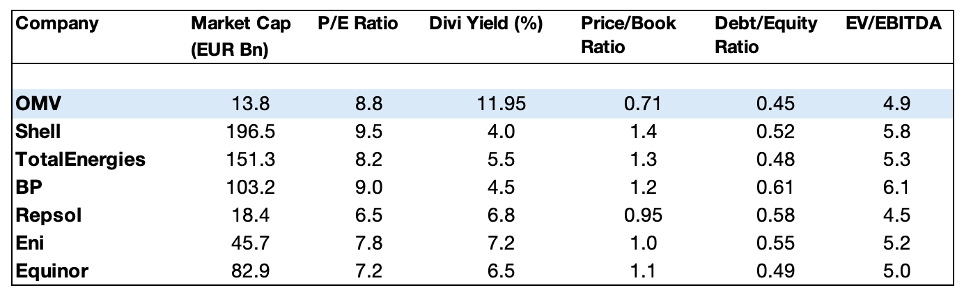 Prezzo/valore contabile: 0,71x, suggerendo che il mercato quota OMV al di sotto del suo valore patrimoniale netto: “si compra la redditività e gli assets sono in omaggio”: un mismatch che forse indica scarsa domanda dei titoli derivante dai vincoli ESG dei gestori, più che dalle concrete aspettative di fine dei carburanti fossili.