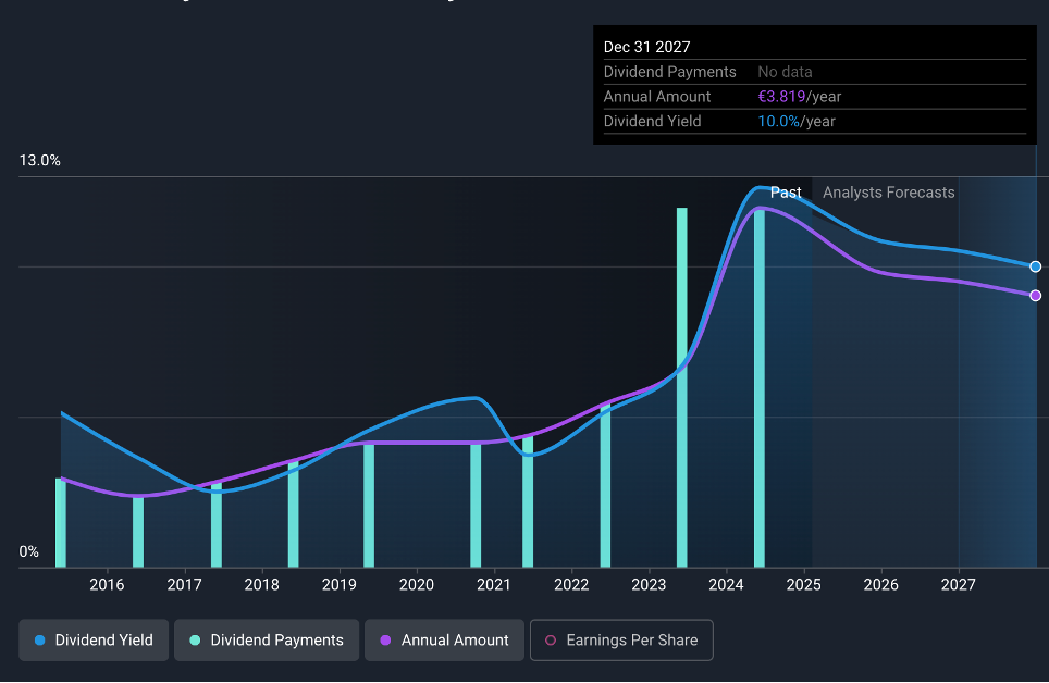Con un EPS (Utile per azione) di 4,53 EUR nel 2023, va detto però che il rapporto di distribuzione supera il 100%, il che indica che i dividendi sono in parte supportati da profitti passati o guadagni speciali piuttosto che completamente dagli utili del 2023. Ciò significa che, se i profitti dovessero mantenersi a questo livello, il dividendo erogato dovrà necessariamente scendere.