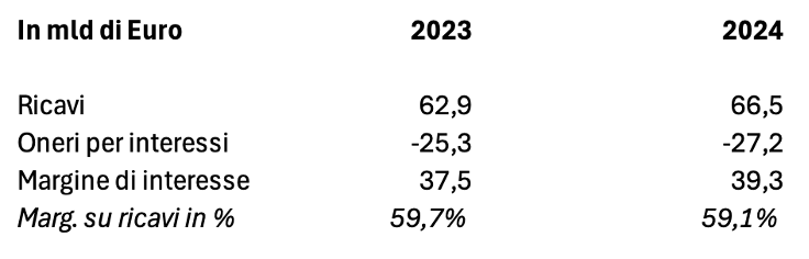 La banca percepisce degli interessi sui propri crediti e si finanzia (anche) facendo dei debiti. Nel conto economico troverete quindi gli interessi attivi e gli interessi passivi, come per una società manifatturiera trovate i ricavi di vendita e i costi degli acquisti che determinano il margine industriale o primo margine.
