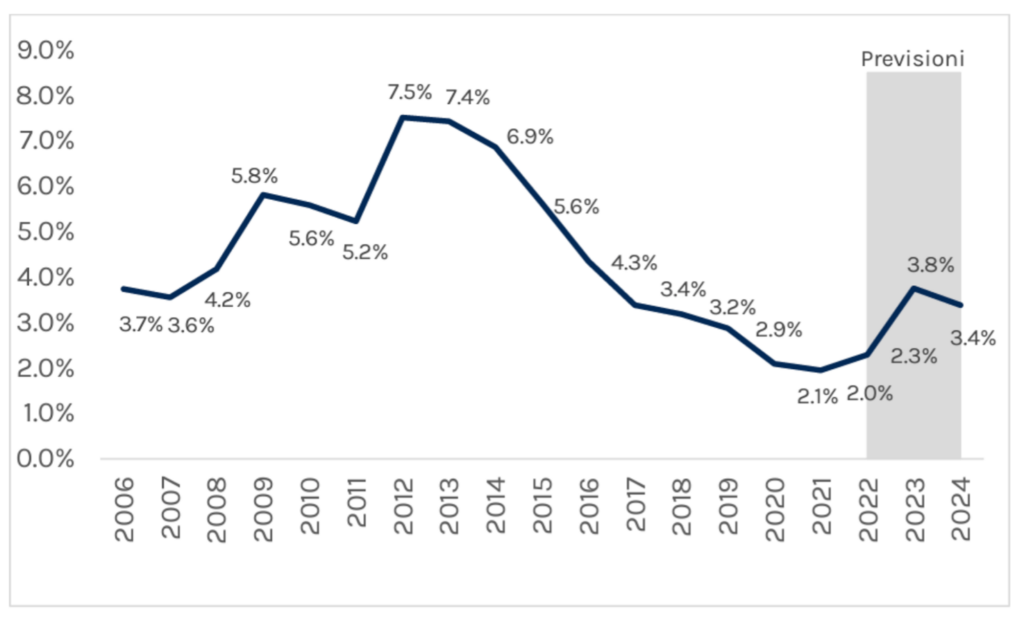 Nel grafico qui sotto si vede l’impatto della crisi del 2008 e poi del 2011 sulle banche italiane, e l’impatto del Covid, che oggi dovrebbe essere rientrato.