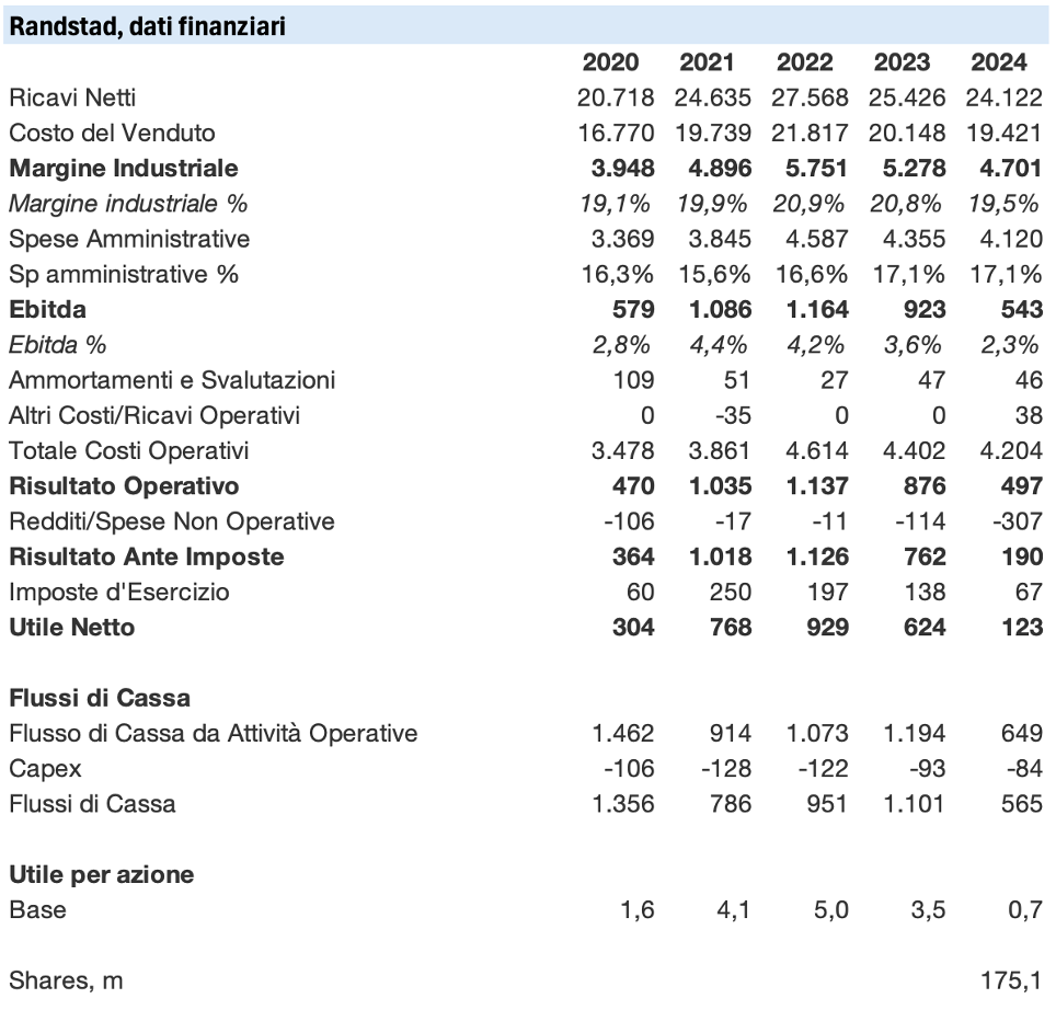 Può sembrare un’enormità, ma considerato il gran numero di uffici che queste aziende tengono aperti sul territorio (Randstad ne ha 4.900 circa in 39 paesi del mondo) e le spese fisse e del personale, a livello di margine operativo sono dei business piuttosto magrini: Ebitda margin del 5% se va bene, in anni di crisi scende al 2,5%, com’è stato per Randstad nel 2024.