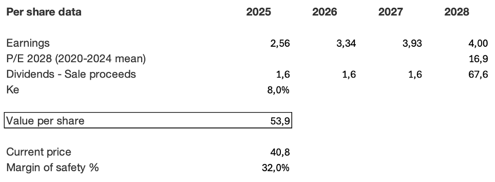 Se ipotizziamo la cessione dopo tre anni di detenzione al p/e medio storico del titolo, che nel periodo 2020 – I sem 2024 è stato di 16,9x; determiniamo un valore per azione di quasi 54 euro, con un margine di sicurezza del 32%: un dimensionamento corretto per questo tipo di business, fortemente inserito nel tessuto economico dei 29 paesi in cui opera.