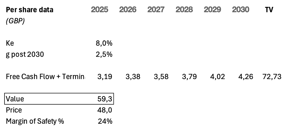 I flussi di cassa liberi per azione previsti, che passano da GBP 3,19 nel 2025 a 4,26 nel 2030, delineano un percorso di crescita moderata ma costante (circa il 5% annuo), in linea con la strategia di Unilever centrata su premiumizzazione, focalizzazione sui grandi marchi e recupero di efficienza operativa. Il valore terminale stimato in GBP 72 è ricavato dalla proiezione della crescita post 2030 al 2,5% sulla base di un free cash flow di GBP 4,00 a partire dal 2031.