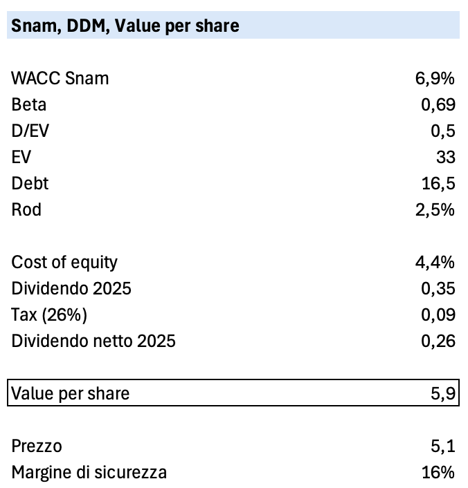 Per il 2025, Snam prevede di distribuire 0,35 euro per azione. Al netto delle tasse, significa 0,26 euro per azione. Attualizzando con il metodo della rendita perpetua questo valore per il costo del capitale equity (derivato per differenza dal WACC che ci viene fornito per il calcolo stesso della redditività degli attivi dell’azienda dall’Ente regolamentare) si ottiene un valore per azione pari a circa 5,9 euro, con un ancora discreto (data la qualità dell’asset) margine di sicurezza.